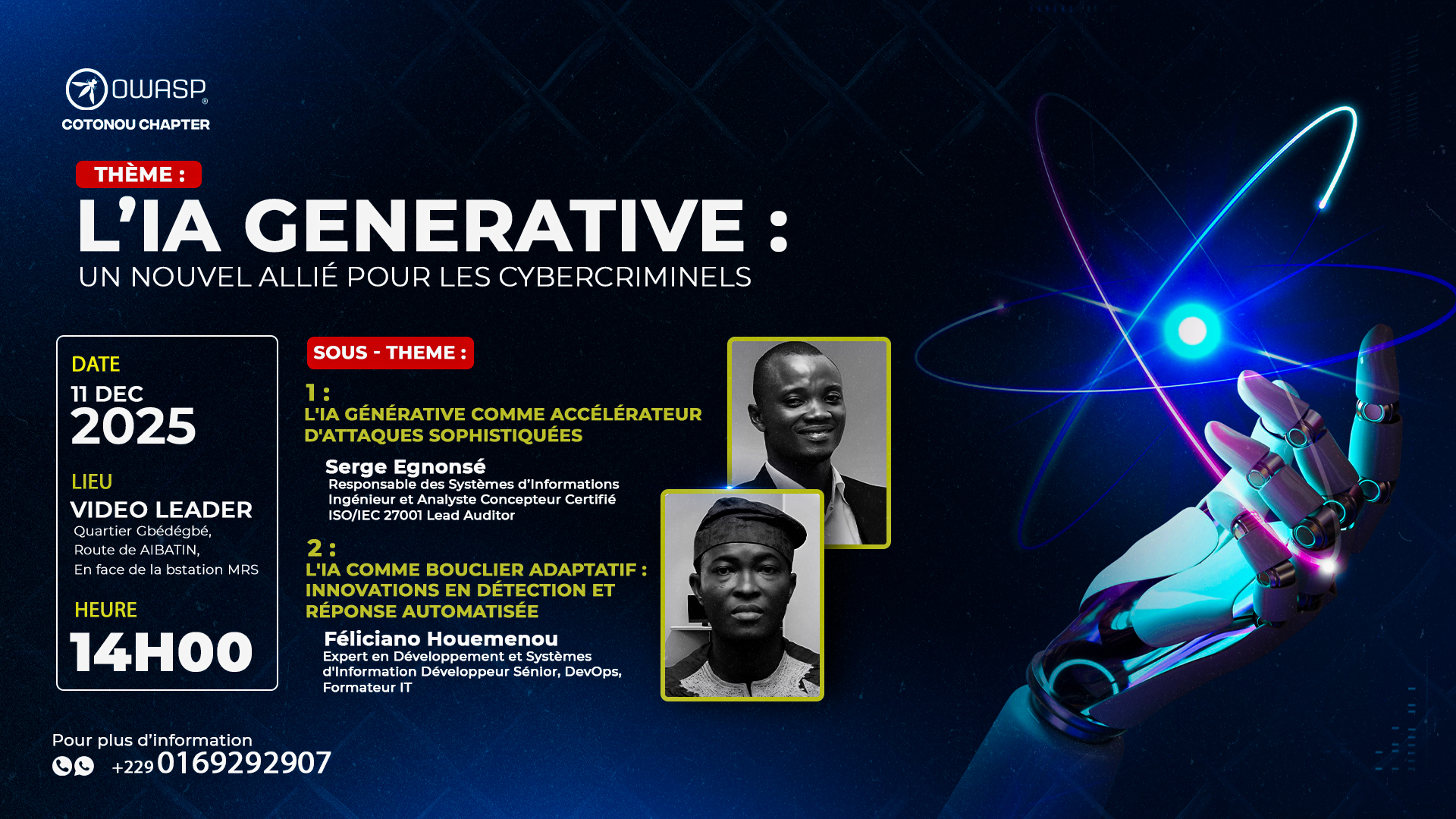 Le Chapitre OWASP Cotonou organise son prochain meeting le Jeudi 11 décembre 2025 à VideoLeader à Gbèdégbé ? , Cotonou, RB à 14h 00.
