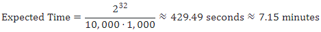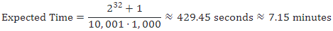 Let’s consider that the target website is using 32 bits of entropy for its session identifiers. This is a fairly active website with 10,000 valid sessions at any given moment. The attacker is able to leverage one or more computers to send 1,000 guesses per second. Let’s calculate how long it’s expected to take for the attacker to guess a valid session ID.