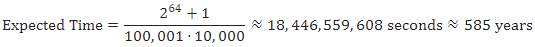 Let’s consider now that the target website is using stronger session identifiers with 64 bits of entropy. This is a very large, active website with 100,000 valid sessions at any given moment. The attacker is able to leverage many computers to send a total of 10,000 guesses per second. Let’s calculate how long it’s expected to take for the attacker to guess a valid session ID.
